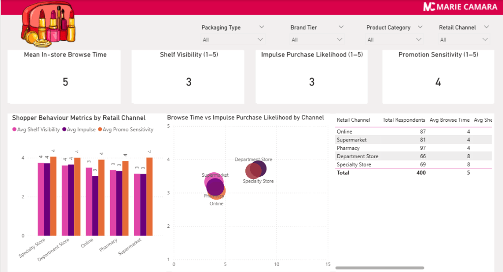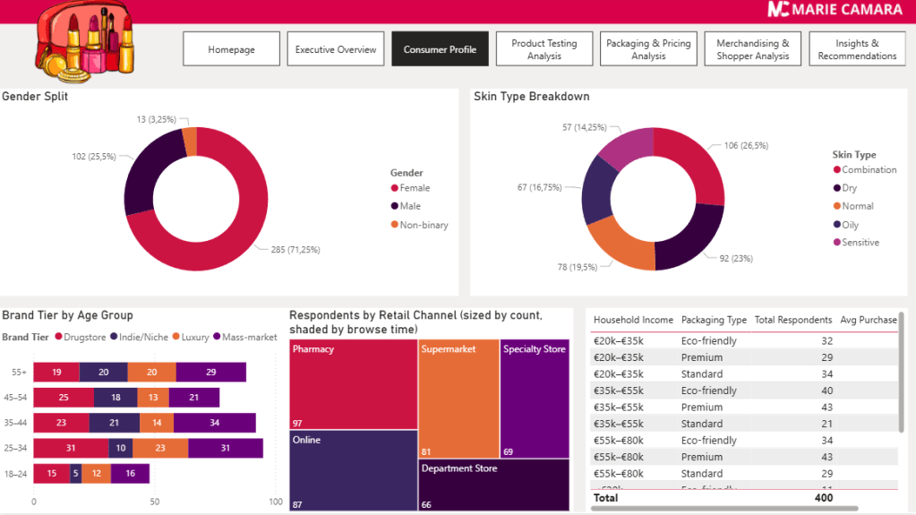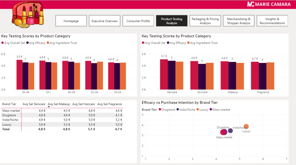 - Data Visualization: Designed a 6-page interactive Power BI dashboard (Executive Overview, Consumer Profile, Product Testing, Packaging & Pricing, Merchandising & Shopper Behavior, Insights & Recommendations) with KPI cards, heatmaps, scatter plots, and advanced filtering