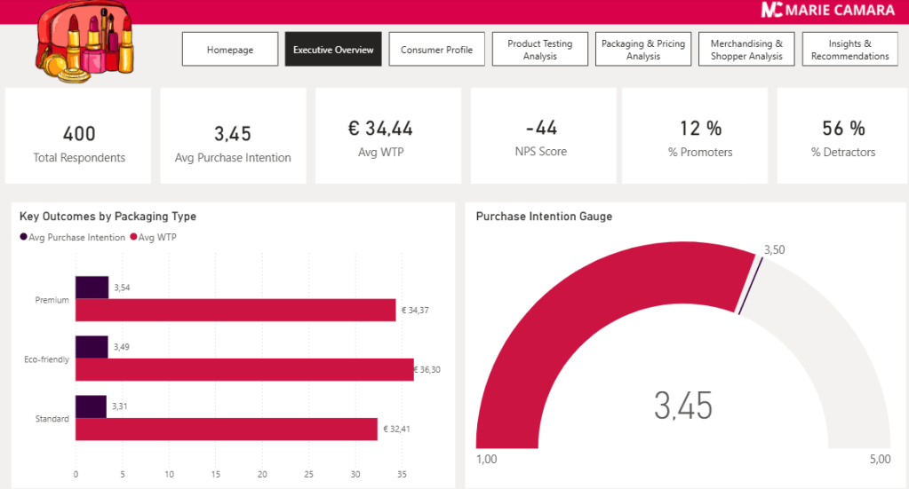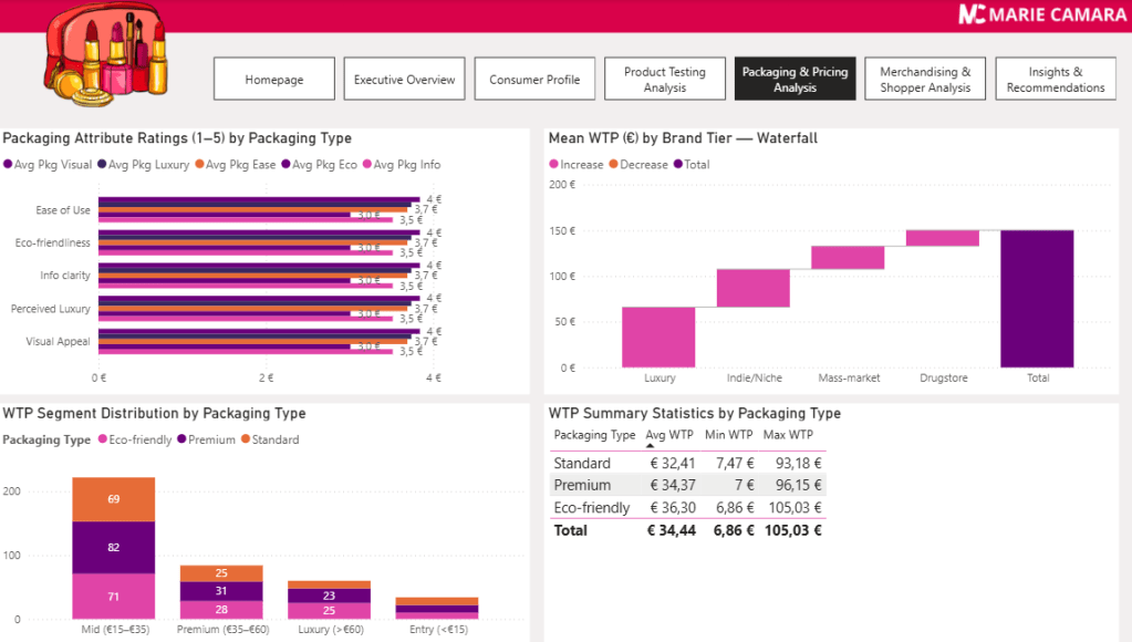 - Data Analysis: Developed DAX measures such as Purchase Intention, Net Promoter Score (NPS), Average Willingness to Pay, and segment-level comparisons across packaging types, brand tiers, and product categories