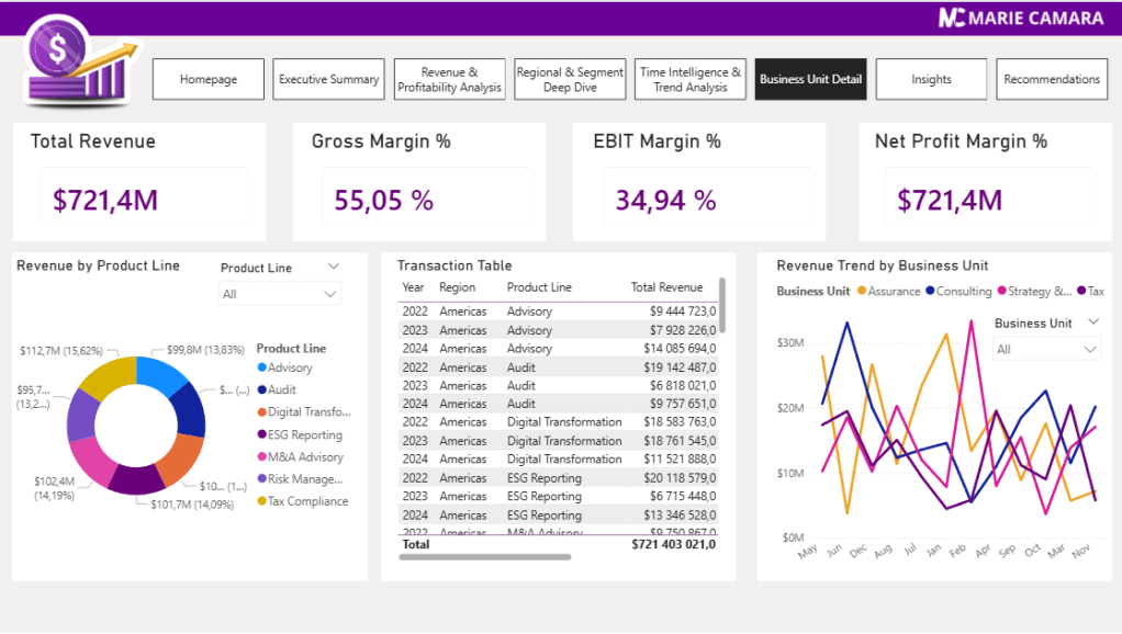 Data Modeling: Built a star schema in Power BI with a central fact table (FactTransactions) and four dimension tables (DimDate, DimRegion, DimBusinessUnit, DimProduct), ensuring time intelligence and single-direction filtering.