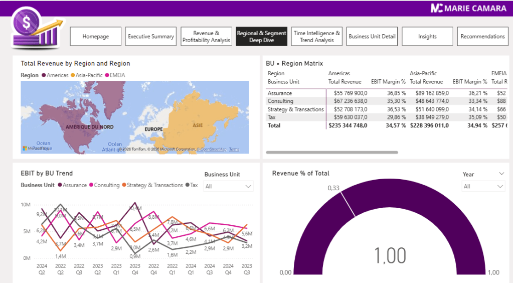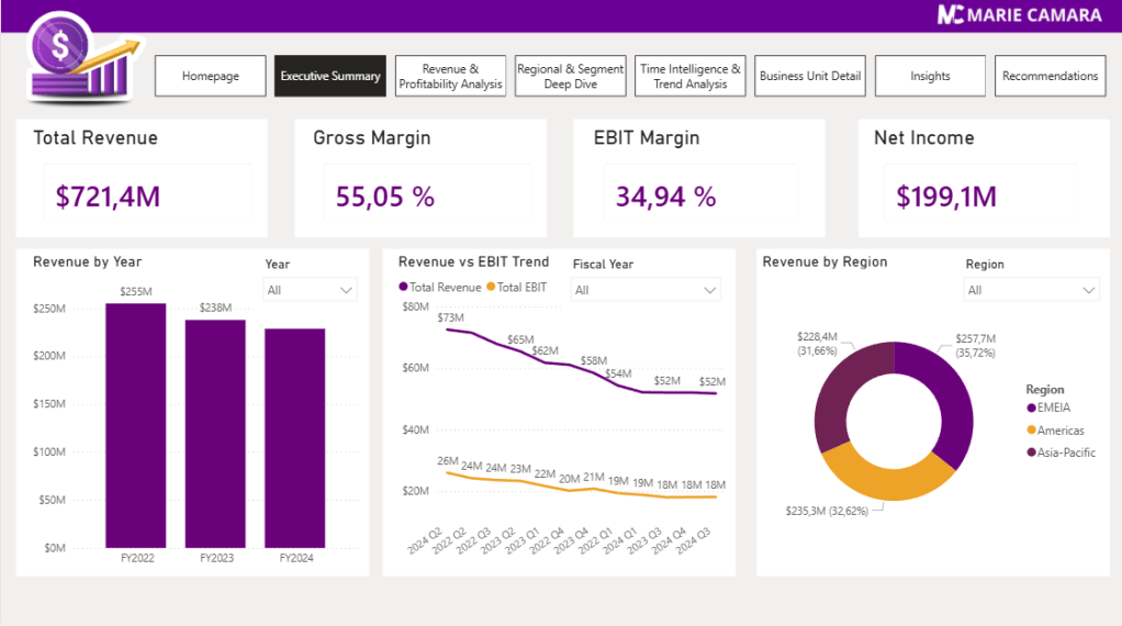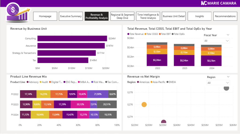Data Visualization: Created a 5-page Power BI report featuring an Executive Summary, Revenue & Profitability, Regional & Segment View, Time Intelligence, and Business Unit Drill-Through, incorporating slicers and drill-through navigation.