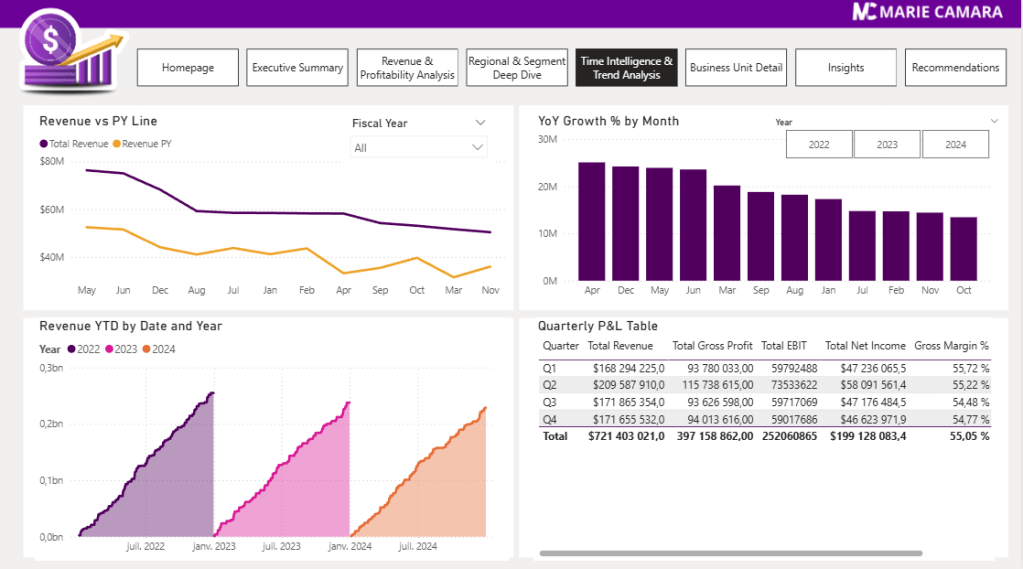 Data Analysis: Developed 24 DAX measures organized into five categories—Base Financials, Margins, Time Intelligence, Context & Ranking, and Dynamic Titles—for comprehensive profitability analysis.